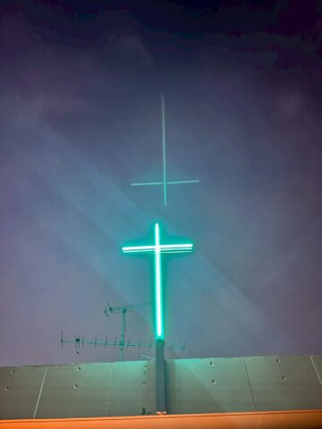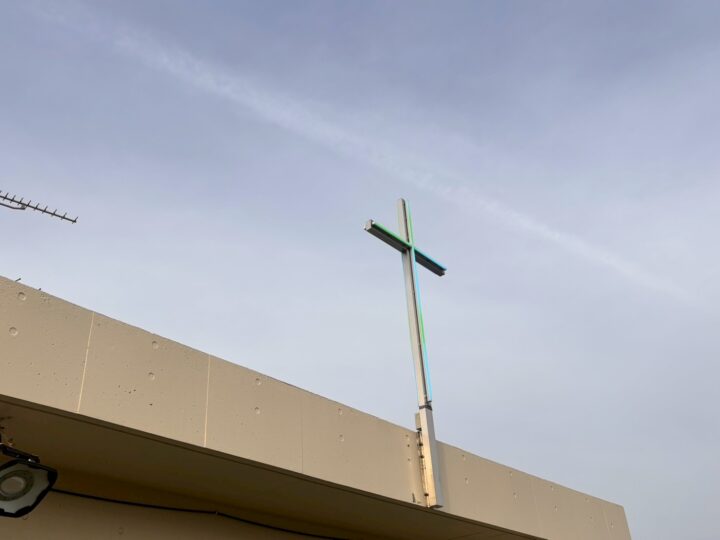 施工では、躯体へのアンカー固定位置を慎重に検討し、強度計算を踏まえた安全な取付を実施。配線は極力目立たないよう納め、外観の美しさにも配慮しました。LED照明は十字架の輪郭が柔らかく浮かび上がるよう光の当たり方や色味を調整し、昼夜で異なる表情を楽しめる仕上がりとなっています。