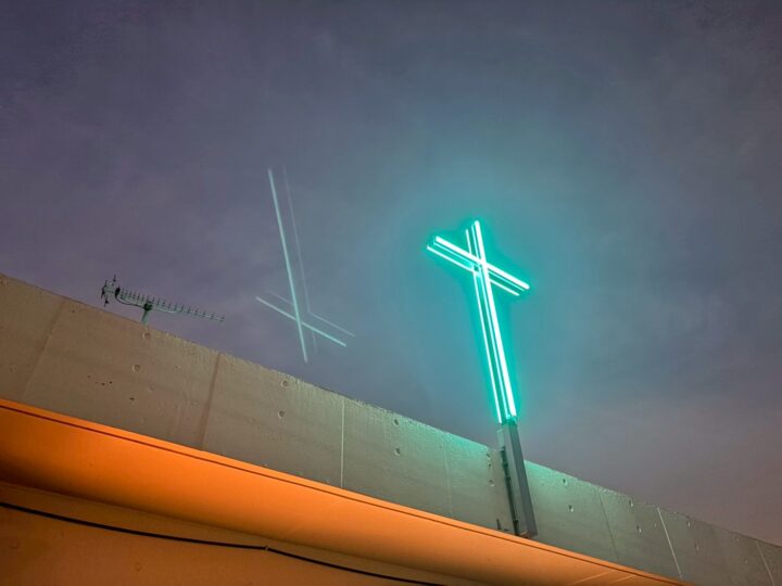 夜間でも輪郭が美しく浮かび上がるよう、LEDの配置・照射角度・光量に強くこだわりました。単に明るくするのではなく、十字架のラインが立体的に見えるよう光の当たり方を調整。遠くからでもはっきり認識できる明るさを確保しつつ、まぶしすぎない上品な光を目指しました。
